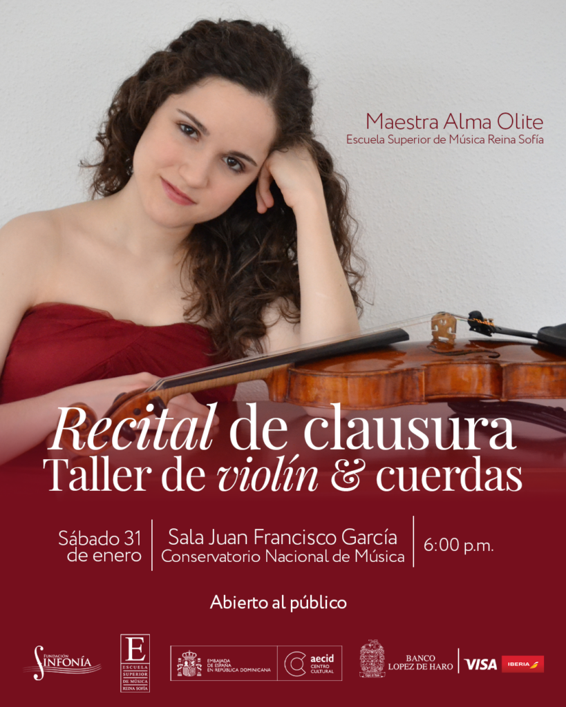 Fundación Sinfonía invita al recital de cierre del Taller de violín y cuerdas con la maestra Alma Olite, alumni de la Escuela Superior de Música Reina Sofía. Con la participación especial de una selección de los estudiantes del taller. Será realizado el sábado 31 de octubre a las 6:00 p.m. en la Sala Juan Francisco García del Conservatorio Nacional de Música.